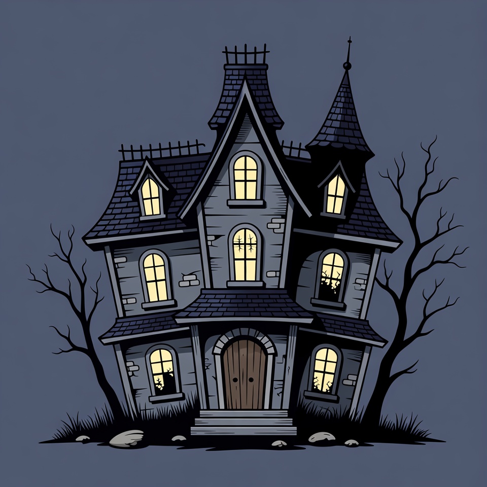 A cartoon illustration of a tall, dark haunted house with multiple turrets and steep roofs stands against a night sky. Lit windows glow eerily from within the stone structure, surrounded by barren trees and rocks on a grassy base. The wooden front door is centered under a porch, with broken windows adding to the ominous appearance.
