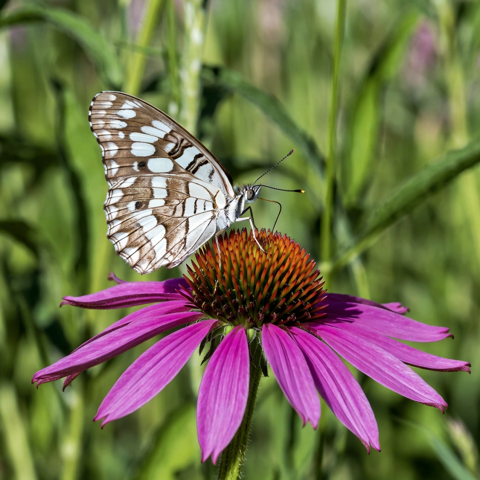 coneflower, echinacea, flower, green grass, insects, macro, marbled wings, nature, orange center, outdoors, pink coneflower, pink petals, pollinator, white butterfly, wildlife, wings, butterfly