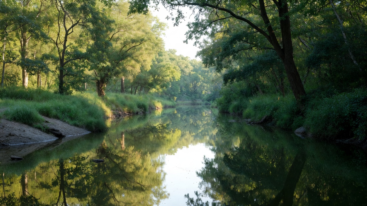 banks, calm, canopy, environment, foliage, forest, grass, green trees, greenery, landscape, lush forest, mirror image, nature, outdoor, peaceful, reflection, riverbank, sand, serene, stream, sunlight, trees, vegetation, water, woods, river