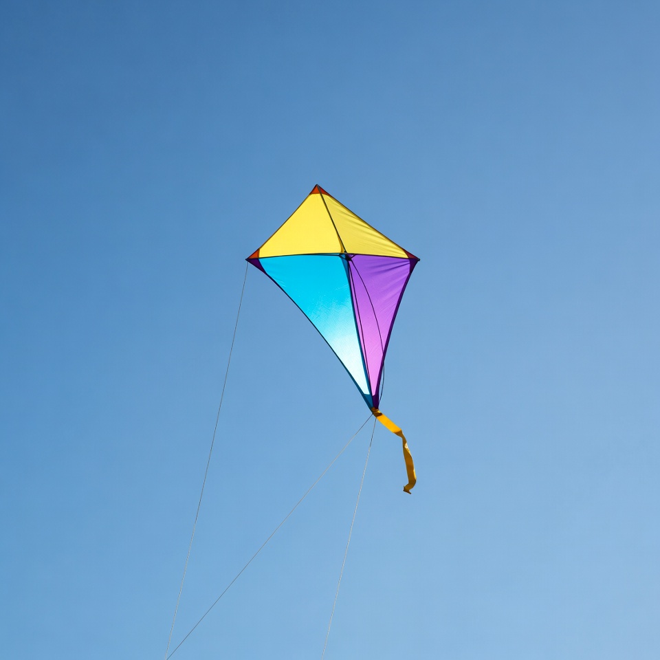 A vibrant diamond-shaped kite with yellow, blue, and purple panels floats against a clear blue sky. It has thin strings attached and a yellow ribbon tail streaming behind. The kite is isolated on the bright sky background.