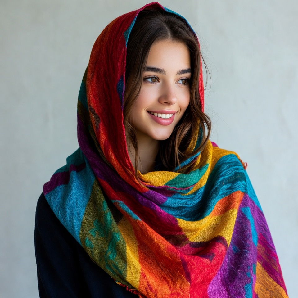 A young woman with long brown hair smiles gently while wearing a vibrant multicolored headscarf draped over her head and shoulders. She has striking green eyes and fair skin, dressed in a dark top against a plain light background. The headscarf features bold shades of red, yellow, blue, and purple.