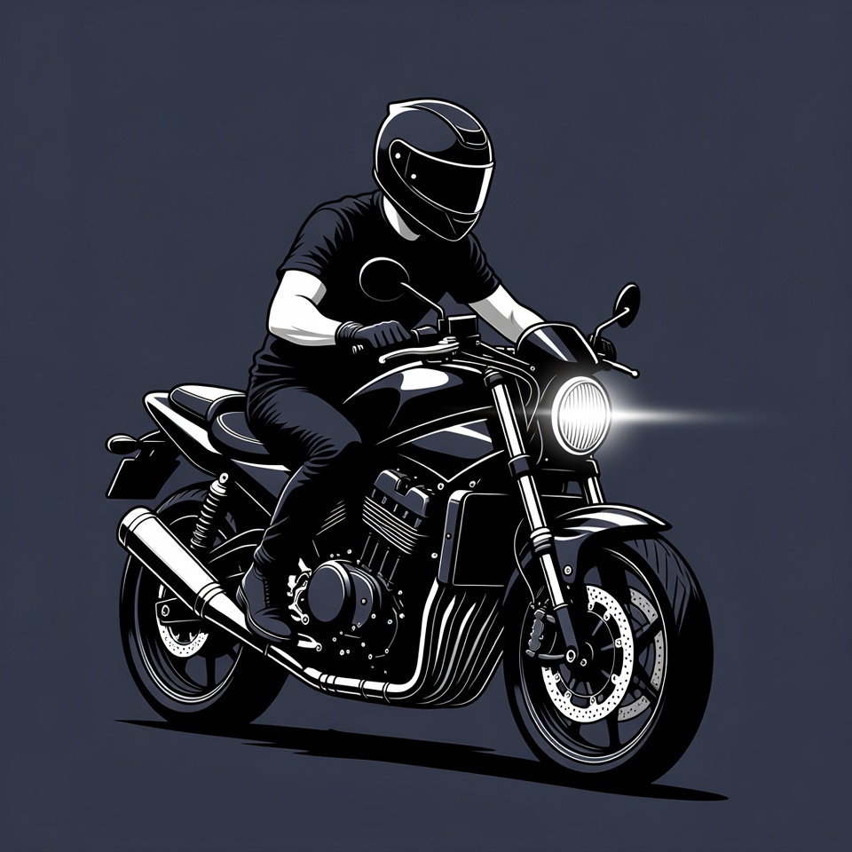 A man wearing a black helmet and t-shirt rides a sleek black sport motorcycle on a dark background. He leans forward with gloved hands on the handlebars, headlight beaming brightly ahead. The illustration features bold black line art with dynamic motion lines.