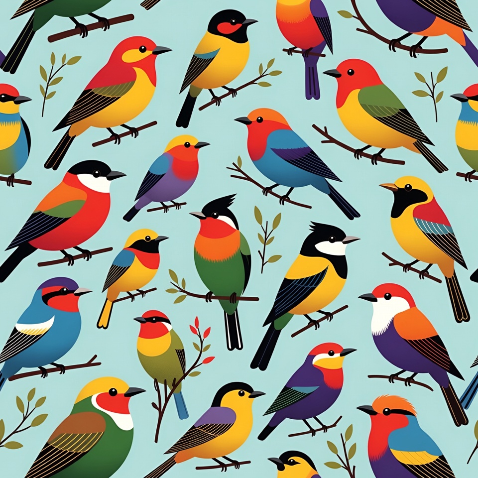 A vibrant seamless pattern features various colorful birds perched on branches and twigs. The birds display bright feathers in reds, yellows, blues, greens, and purples against a light blue background. Small green leaves and twigs add natural accents to the repeating illustration design.