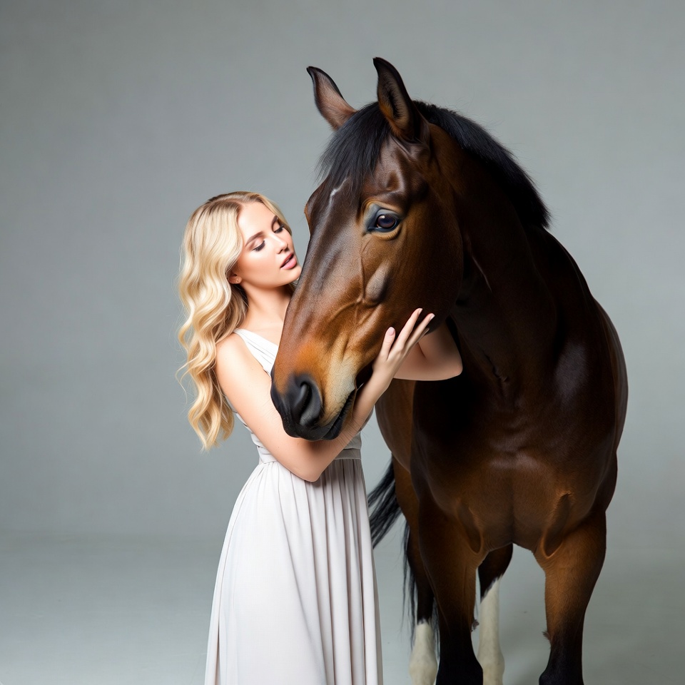 A young blonde woman with wavy hair embraces a large brown horse on a plain gray background. She wears a flowing white dress and gently holds the horse's muzzle. The horse stands calmly with its head turned toward her.