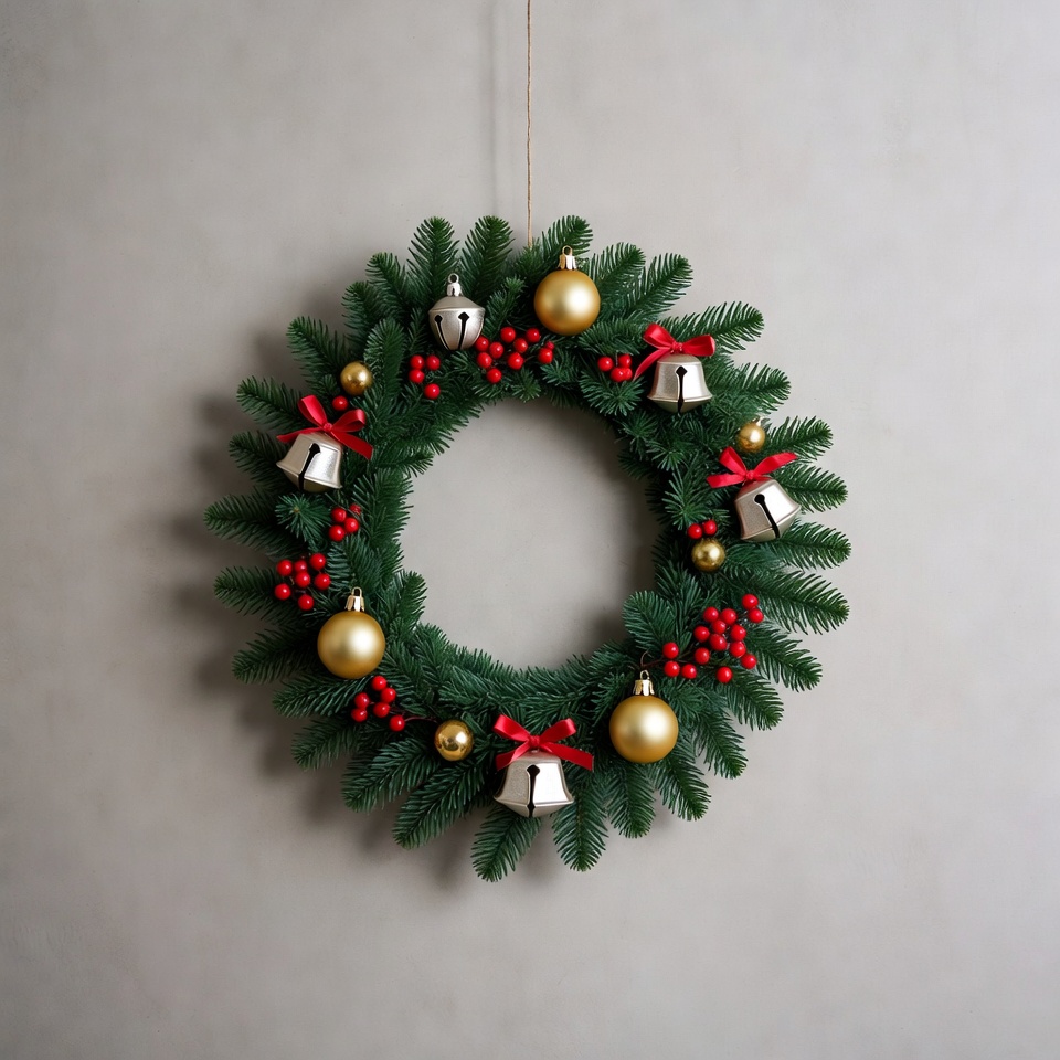 A festive Christmas wreath made of green pine branches hangs against a light gray background. It is decorated with red holly berries, gold and silver bells, red bows, and gold ornaments. The wreath has an open circular center.