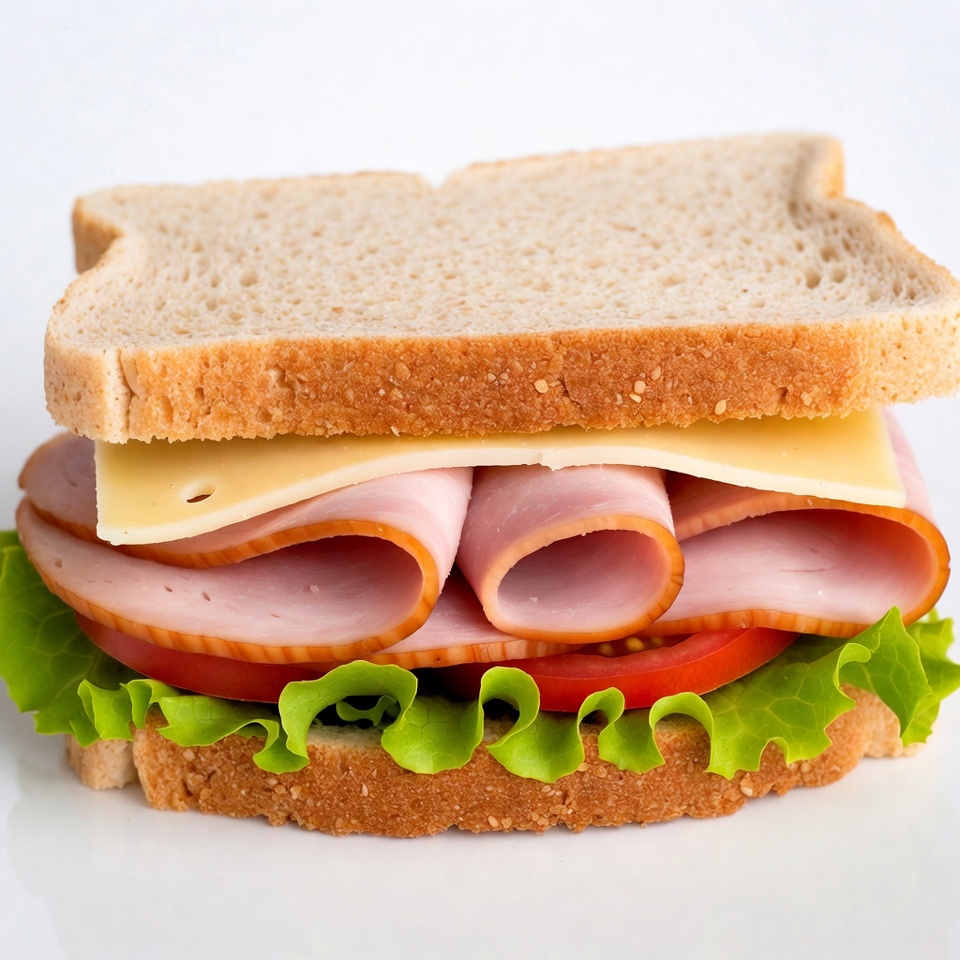 A ham and cheese sandwich is stacked on a white background. Slices of pink ham and yellow cheese are layered between thick wheat bread. Fresh green lettuce and red tomato slices add color to the top.