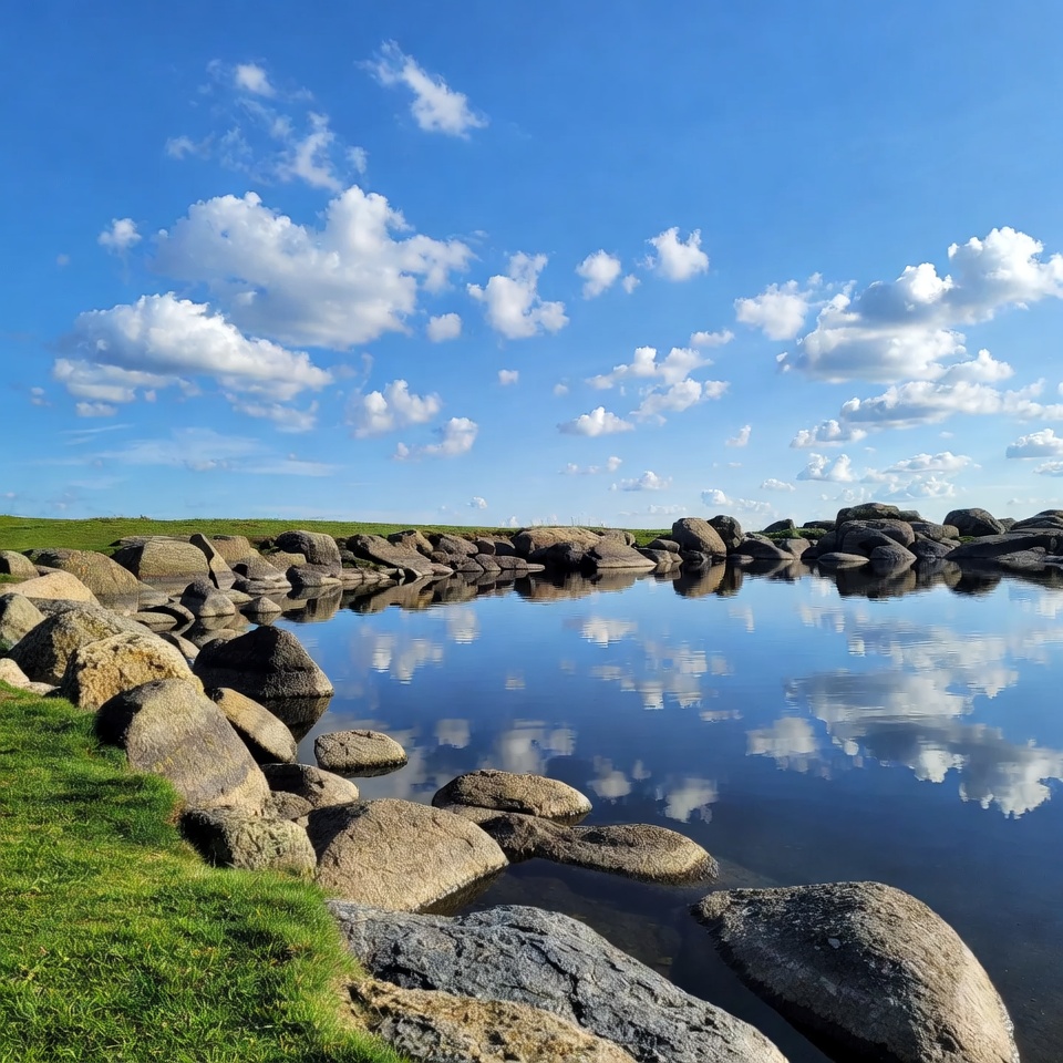 blue sky, boulders, calm water, clear sky, grassy edge, green grass, lake, landscape, mirrored sky, natural pond, nature, outdoor, reflection, rocks, rocky shore, scenery, stones, water, white clouds, pond