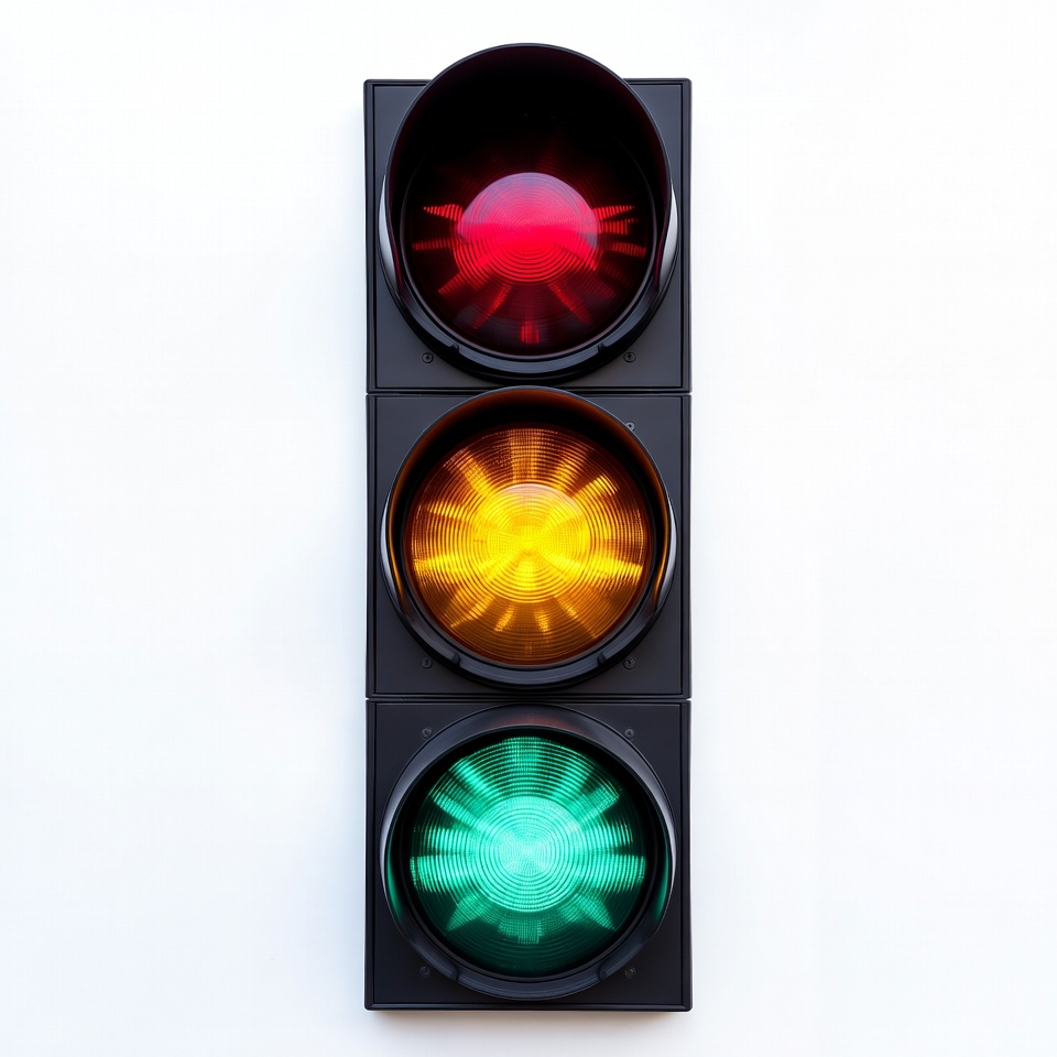 A standard three-light traffic signal is displayed against a white background. The top red light is illuminated, the middle yellow light is on, and the bottom green light glows brightly. Each light features a circular lens with a glowing effect.