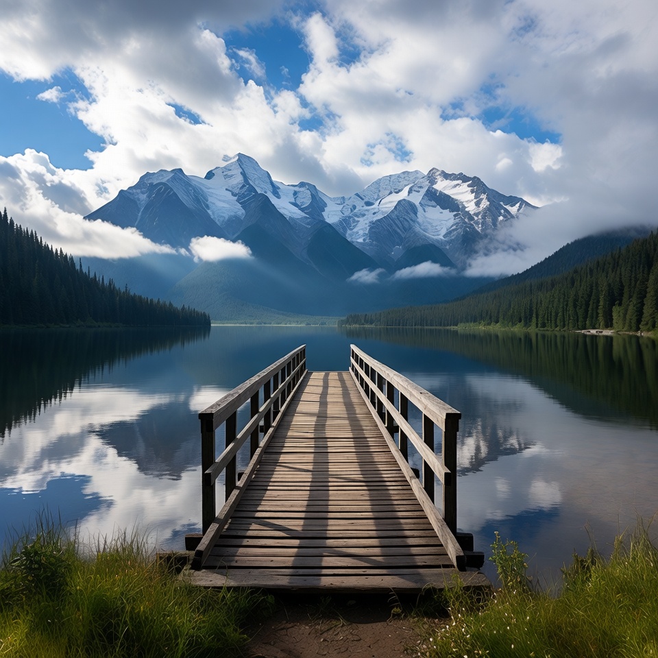 alpine lake, blue sky, calm water, clouds, cloudy sky, dock, evergreen forest, forest, grass, lake, landscape, mountain range, mountains, nature, outdoors, peaceful lake, peak, pier reflection, reflection, scenery, snowy mountains, summit, trees, water, wilderness, wooden pier