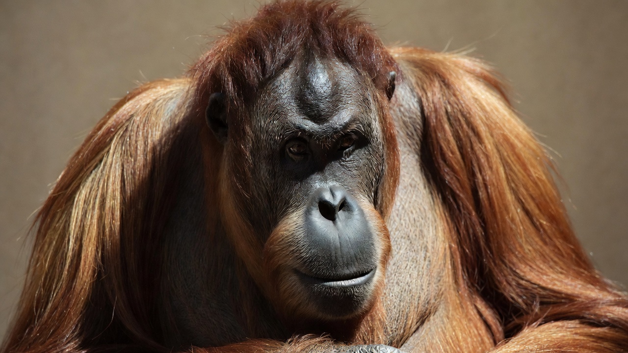 animal, ape, brown fur, close-up, eyes, face, isolated background, mammal, monkey, nose, portrait, primate, reddish fur, wildlife, zoo animal, orangutan