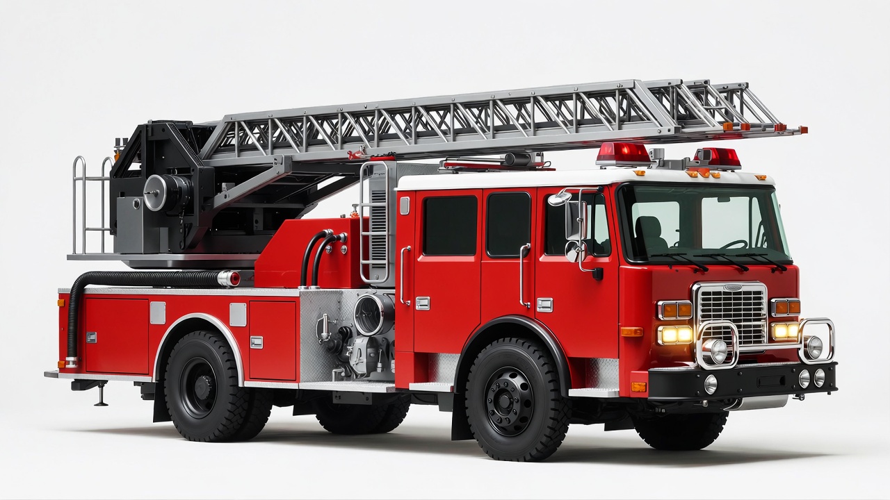 cab, chassis, emergency vehicle, fire engine, firefighter truck, headlights, isolated, ladder truck, red fire truck, red lights, rescue truck, silver ladder, truck wheels, white background, fire truck