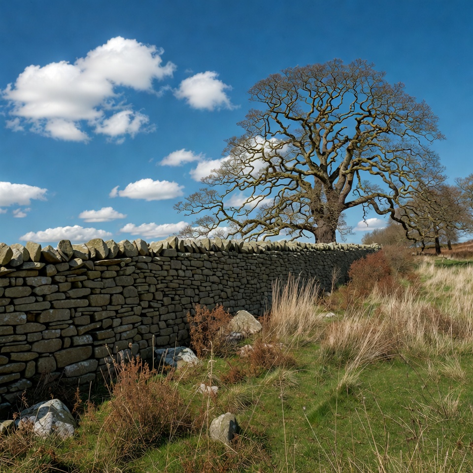 ancient tree, bare tree, blue sky, countryside, deciduous tree, dry stone wall, fence, field, gnarled tree, grass, landscape, moorland, nature, outdoors, pasture, rocky wall, rural landscape, shrubs, spring scenery, stone wall, wall, white clouds, oak tree