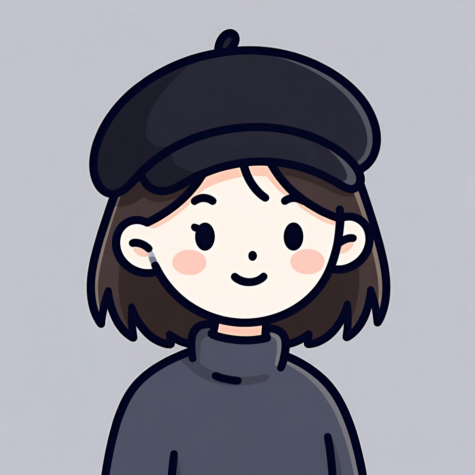 A cute cartoon girl with short brown hair smiles happily while wearing a black beret hat. She has rosy cheeks and large expressive eyes, dressed in a dark turtleneck sweater. The illustration features a simple gray background.