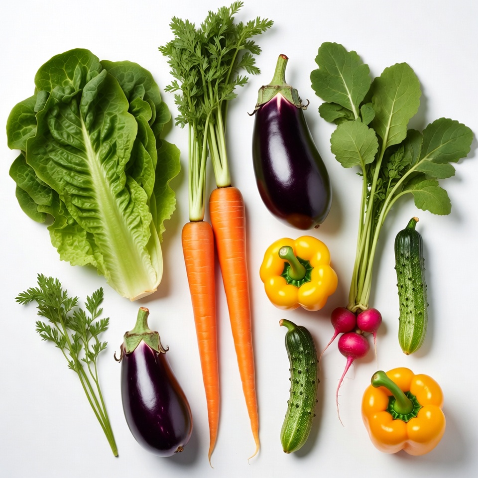 bell peppers, carrots, cucumbers, eggplants, fresh produce, fresh vegetables, green leaves, healthy food, herbs, isolated vegetables, lettuce, orange carrots, organic vegetables, purple eggplant, radishes, salad ingredients, veggie assortment, white background, yellow pepper, vegetables