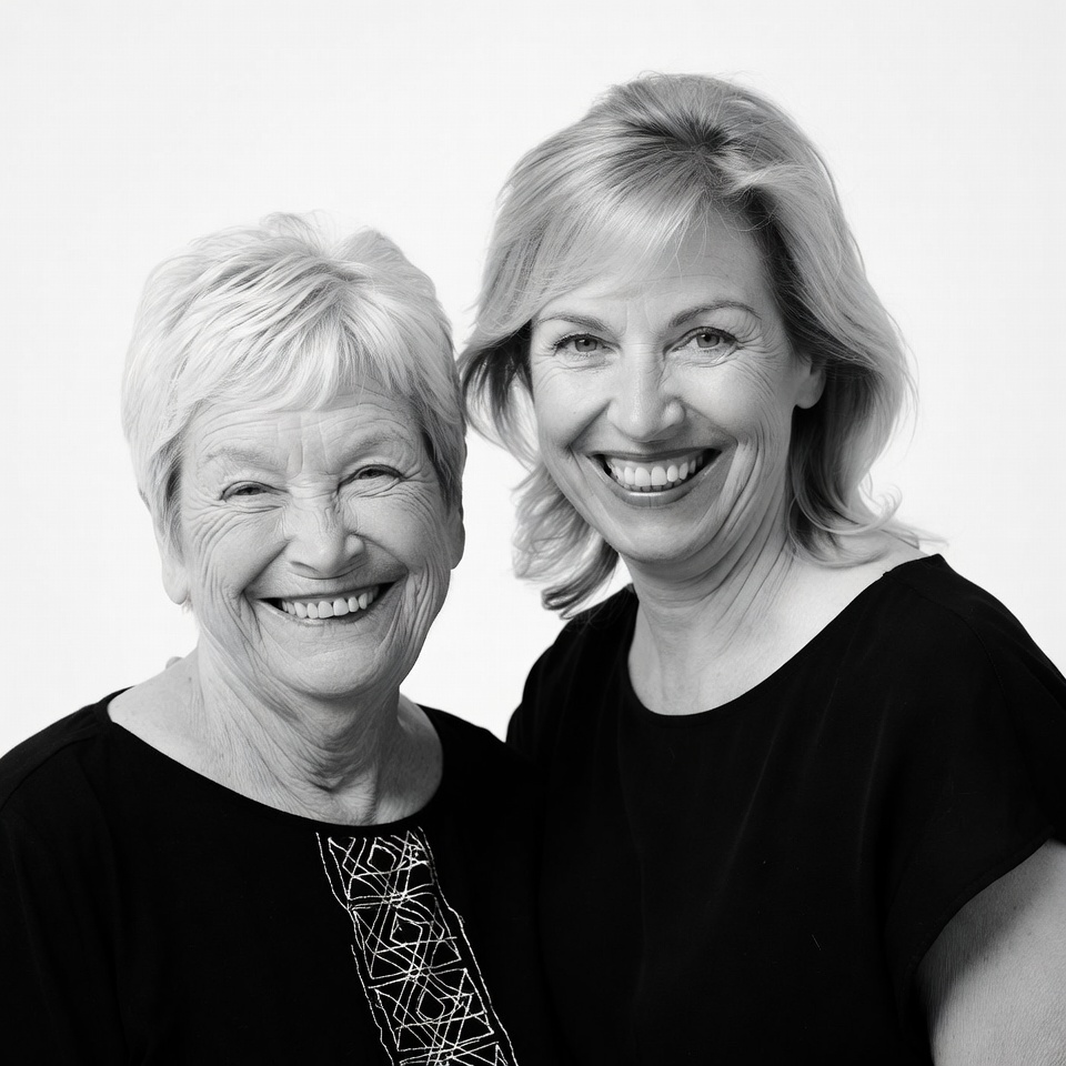 A black and white portrait features an elderly woman with short white hair and her adult daughter with long blonde hair, both smiling warmly at the camera. They wear dark tops and stand close together against a plain white background. Their joyful expressions and similar facial features highlight their familial bond.