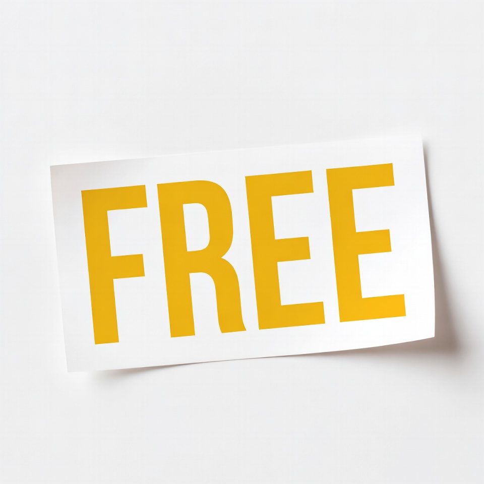 A bold yellow 'FREE' text appears on a white rectangular sticker with slightly curled edges. The sticker is isolated against a plain white background. The design is simple and graphic.