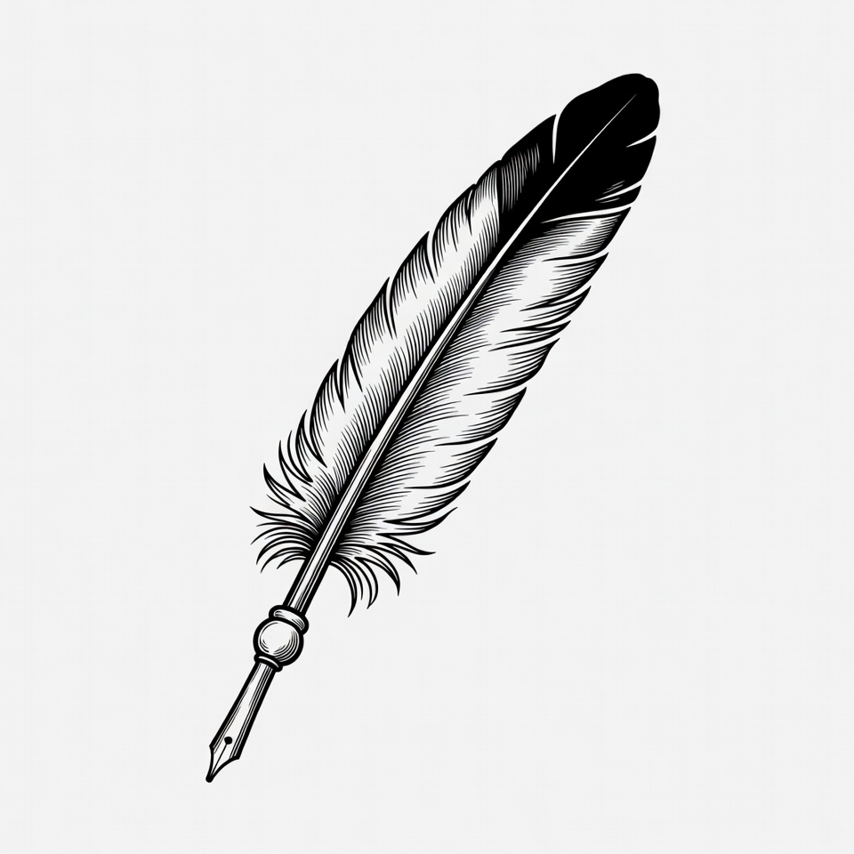 A detailed black and white illustration of a vintage quill pen with soft feathers and a metal nib. The feather transitions from white to black at the tip, and the pen features a decorative bead on the shaft. It is isolated on a plain white background.