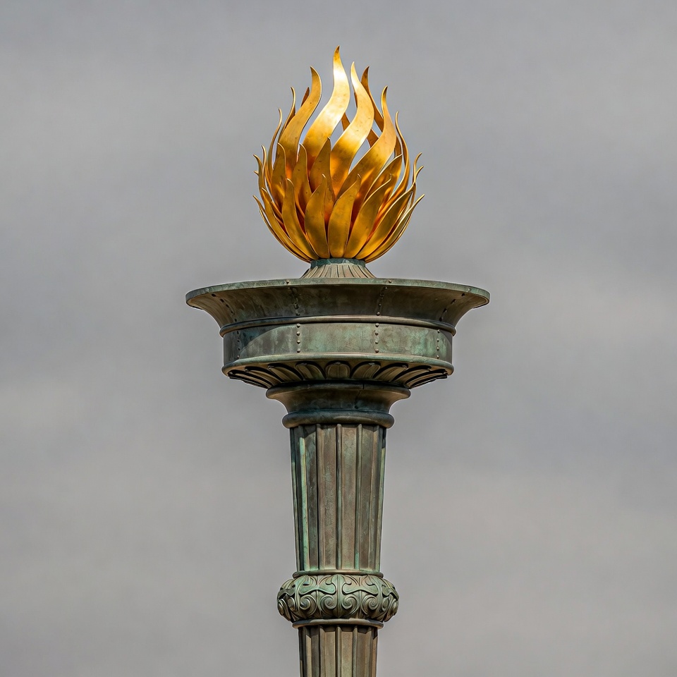 A tall bronze torch with intricate detailing supports a vibrant golden flame at the top. The flame features stylized, wavy shapes in bright gold against a cloudy gray sky. The pedestal base is ornate and weathered.