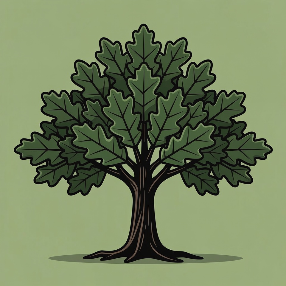 A detailed vector illustration of a large oak tree with numerous lobed green leaves and a sturdy brown trunk. The tree stands prominently against a light green background. It features a full canopy and visible roots at the base.