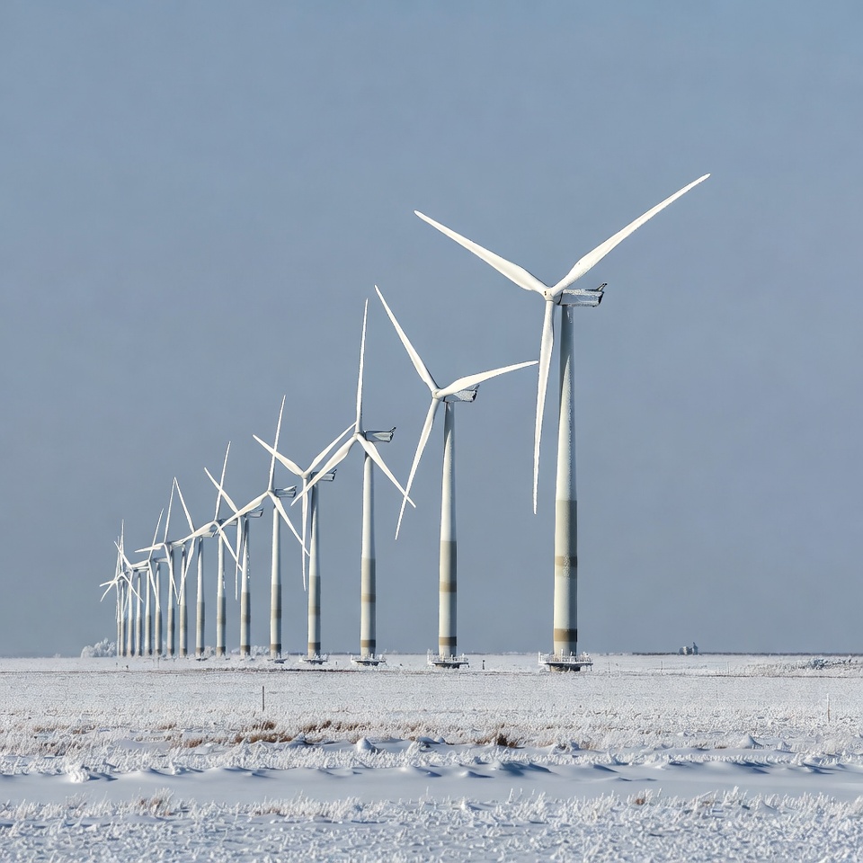 blue sky, clean energy, energy production, field snow, renewable energy, snow ground, snowy field, turbine array, turbine blades, turbines row, white turbines, wind farm, wind power, winter landscape, wind turbines