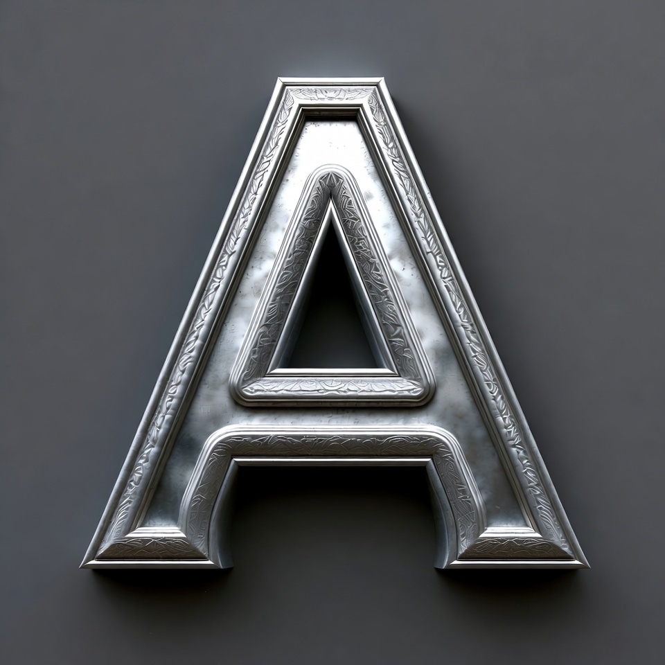 A large, ornate letter A rendered in shiny metallic silver with intricate engraved details. It features a brushed metal texture and elegant filigree borders. The letter is centered against a smooth dark gray background.