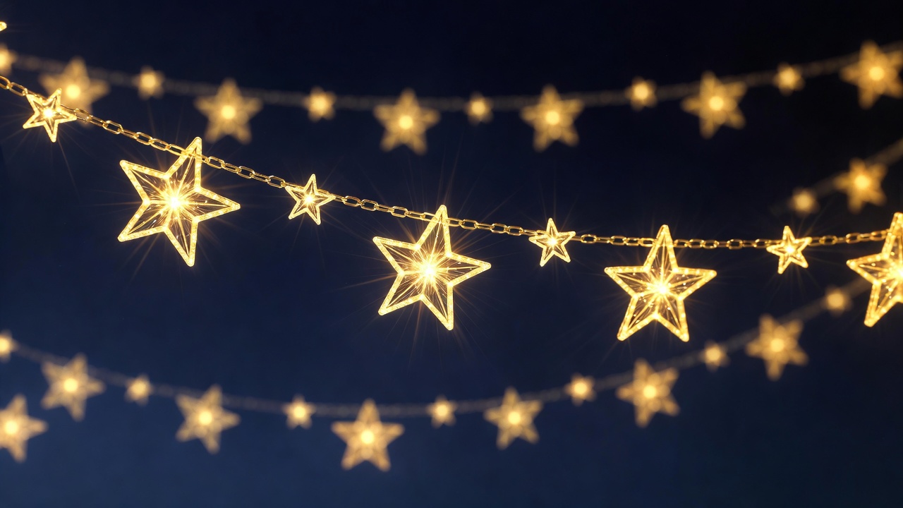 A string of glowing golden star-shaped lights hangs against a dark background. The stars are connected by thin chains and emit a warm, bright illumination. Multiple rows of stars create a festive lighting effect.
