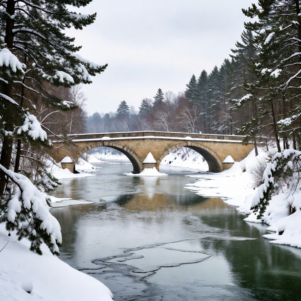 A historic stone arch bridge spans a partially frozen river surrounded by snow-covered pine trees. The bridge features two arches with snow on top and along its sides. Evergreen forests frame the scene under a cloudy sky.
