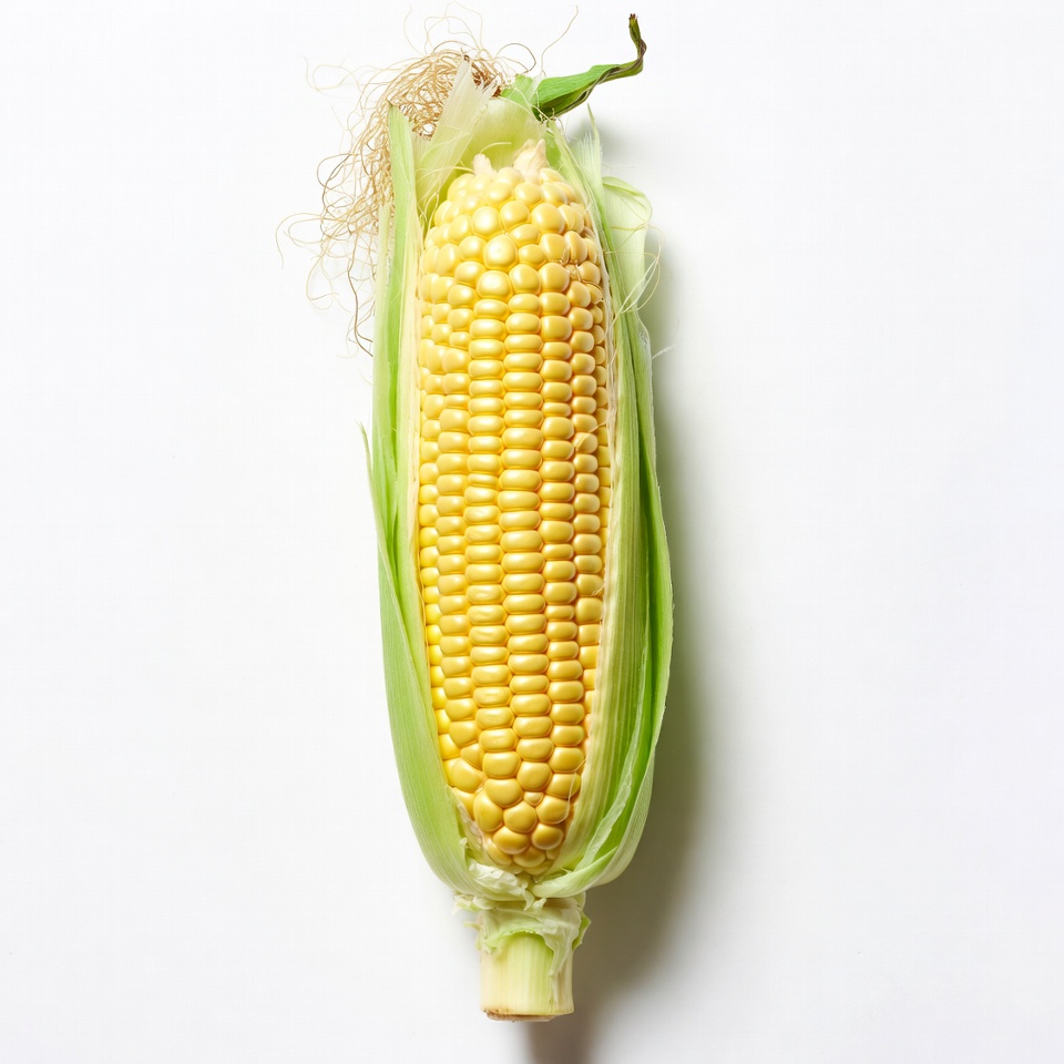 A fresh ear of corn with bright yellow kernels is displayed vertically on a white background. The green husks are partially peeled back, revealing the full cob. Silky strands cling to the top of the ear.