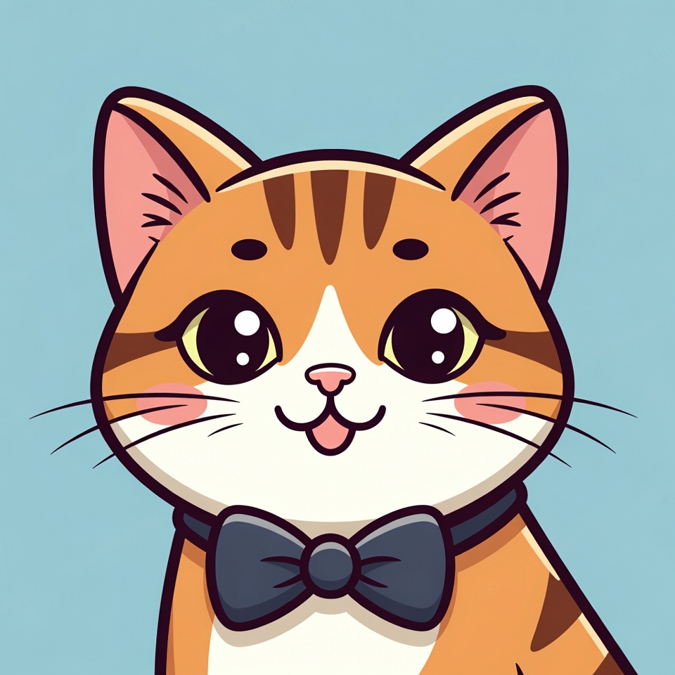 A cartoon orange tabby cat with large sparkling green eyes and a cheerful smile faces forward on a light blue background. It has pink blush on its cheeks and wears a black bowtie around its neck. The illustration features bold black outlines and vibrant colors.