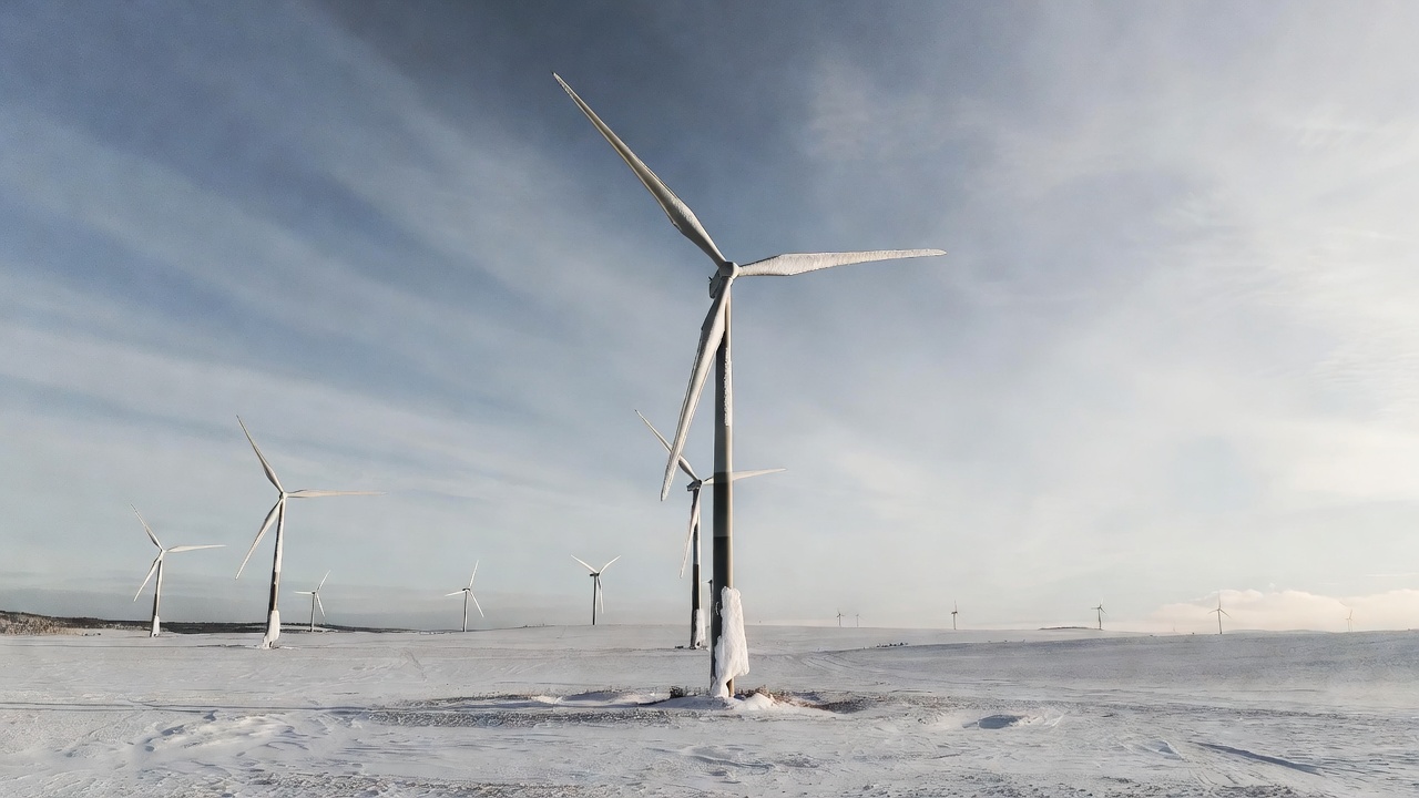 clean energy, clouds, cold weather, electricity, environment, field, frozen, ice, nature, outdoor, plain, power generation, renewable energy, sky, snow, snowy landscape, turbine blades, white turbines, wind farm, winter, wind turbines