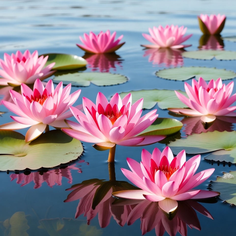 Vibrant pink lotus flowers bloom on the calm water surface surrounded by green lily pads. Their reflections shimmer in the clear blue water beneath. Multiple blossoms cluster together in a serene aquatic setting.