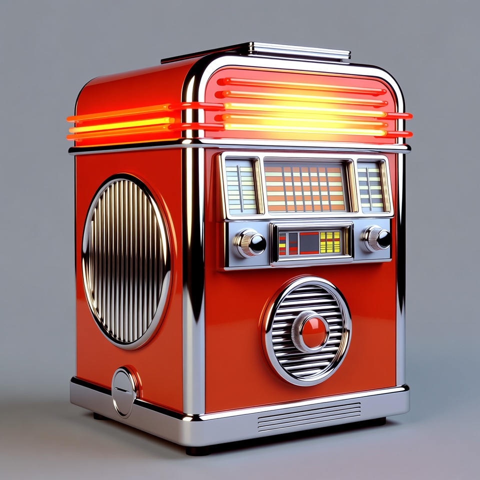 1950s style, 3D render, chrome accents, classic jukebox, control panel, glowing lights, isolated background, music machine, neon lights, red jukebox, retro jukebox, rockola jukebox, speaker grille, vintage jukebox, jukebox