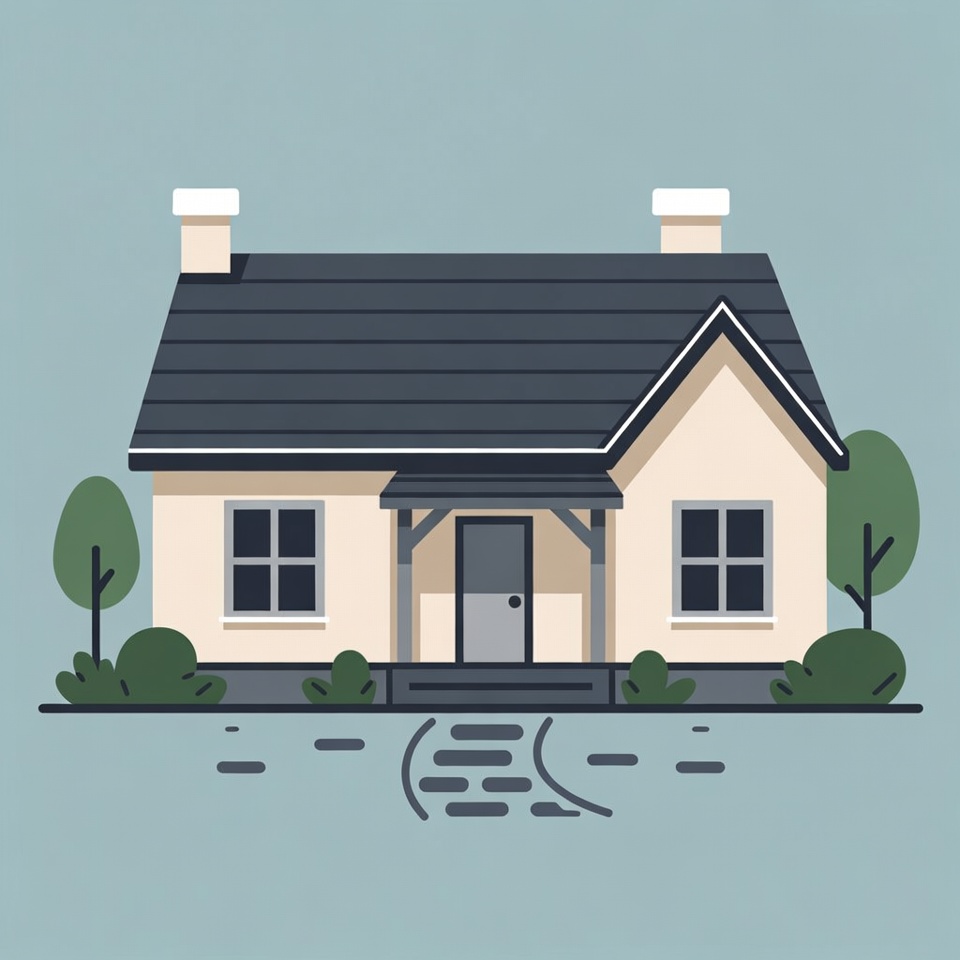A simple flat illustration of a beige house with a dark sloped roof and two chimneys sits on a light blue background. It features a front porch with steps, two windows, a central door, and surrounding green bushes and trees. The style is minimalist vector art with clean lines.