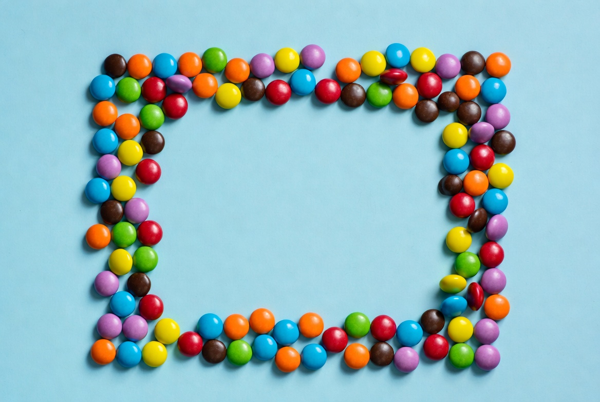 A vibrant frame made of assorted colorful candies forms a rectangular border on a solid light blue background. The candies include red, orange, yellow, green, blue, purple, and brown M&M-style treats arranged neatly around an empty center space. The composition is flat lay style with isolated background.
