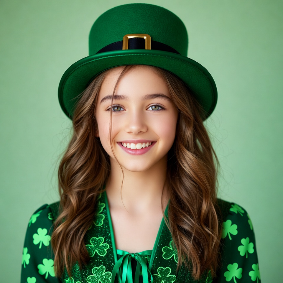 A young girl with long wavy brown hair smiles happily while wearing a green leprechaun top hat with a black buckle. She is dressed in a green shamrock-patterned dress with a green bow tie. The image features a solid green background.