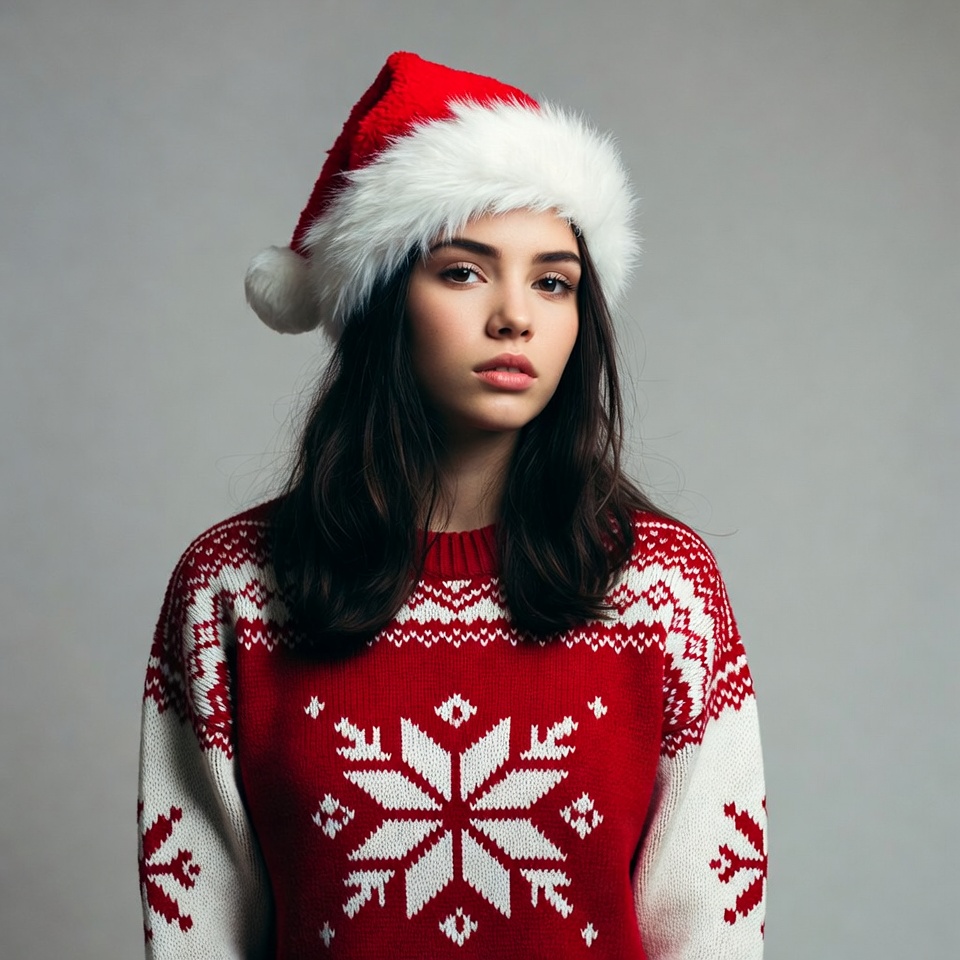 Christmas sweater, Santa hat, dark hair, female, festive outfit, gray background, holiday fashion, knitted sweater, long hair, neutral expression, portrait, red hat, red sweater, snowflake sweater, white fur, white sweater, young woman, woman