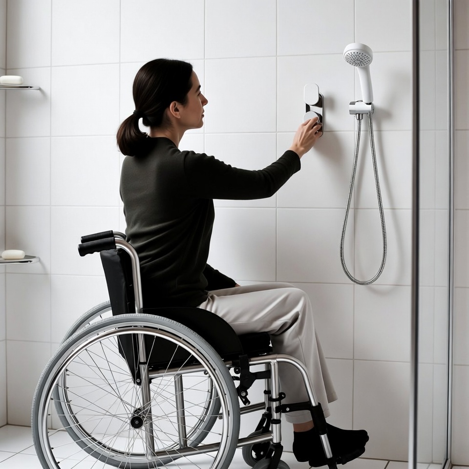 Woman in wheelchair using shower control