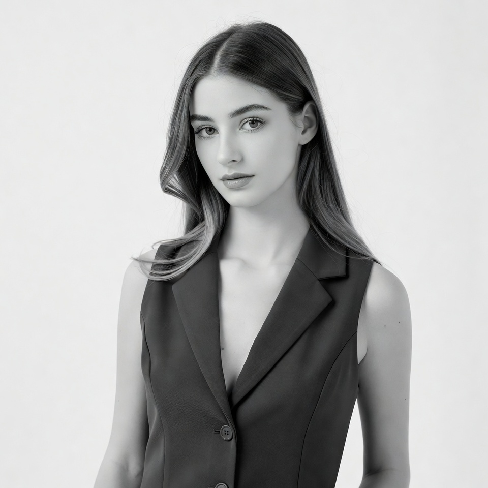 V-neck blazer, White, black blazer, closeup, elegant, fashion, female, headshot, long hair, portrait, serious expression, sleeveless blazer, studio photo, wavy hair, white background, young woman, woman