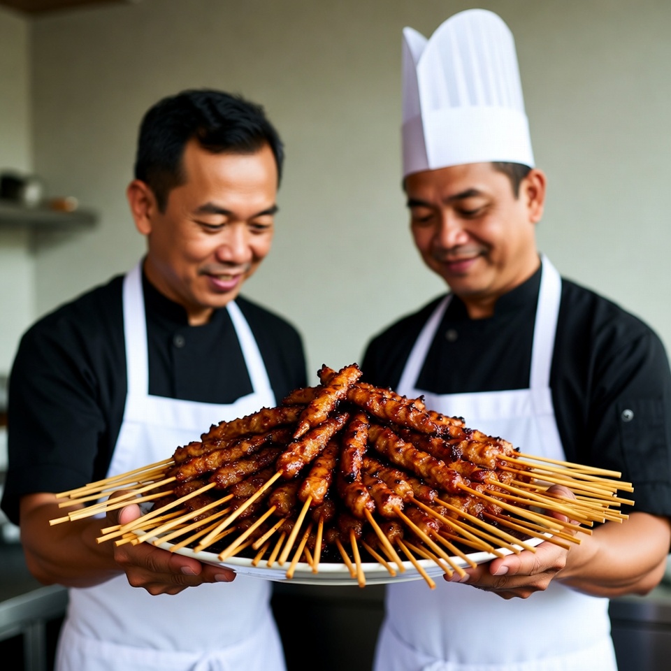 Two Asian Chefs Holding Grilled Skewers