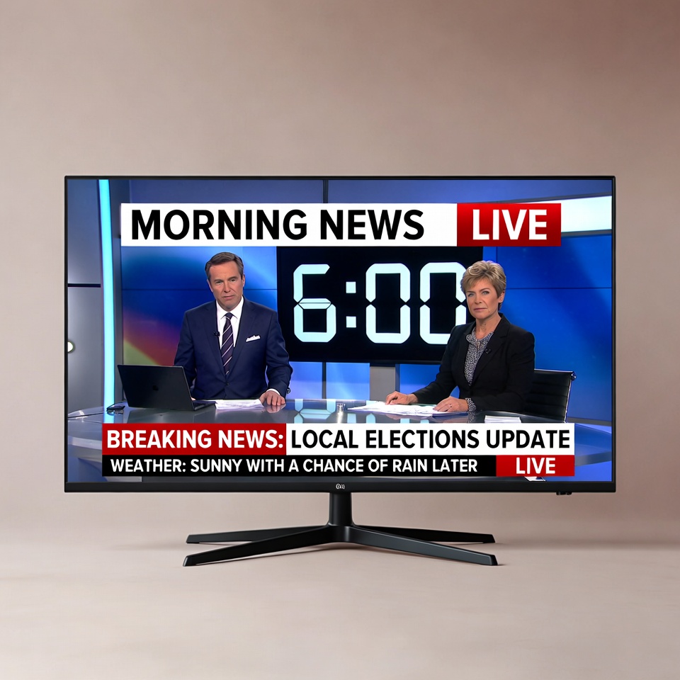 A large flat-screen TV displays a live morning news broadcast at 6:00 with a male and female anchor at the desk. The man wears a navy suit and tie, gesturing with his hands, while the woman in a gray suit sits beside him. The screen shows headlines for breaking local elections update and sunny weather with a chance of rain later.