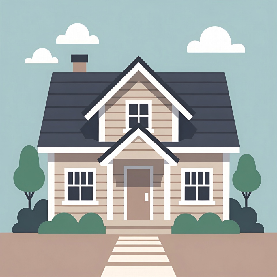 A simple flat illustration of a beige house with a dark gray roof and white trim sits on a light blue background. Fluffy white clouds float above, while green trees and bushes frame the front. A brown path leads to the wooden front door, with black-framed windows on either side.