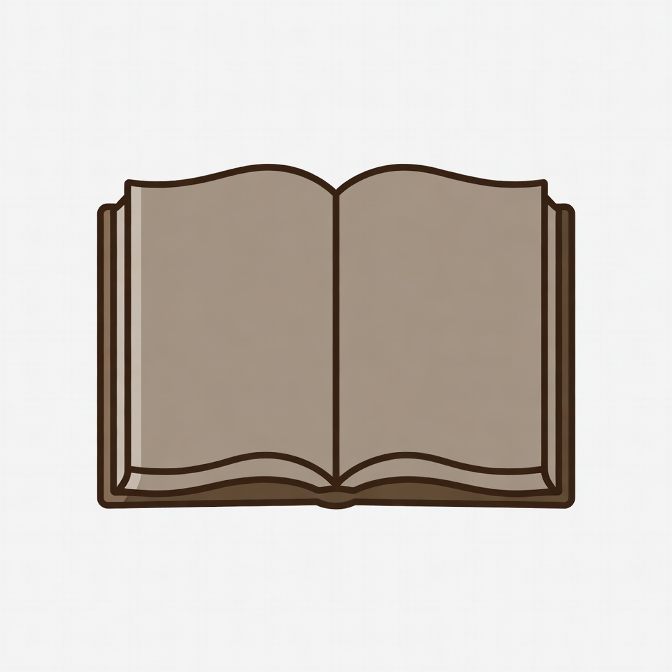 A simple flat illustration of an open book with light brown pages and darker brown covers outlined in black. The book is centered on a white background with blank pages facing outward. The design features clean lines and a minimalist style.