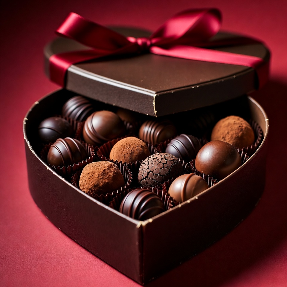A luxurious heart-shaped brown box filled with assorted dark chocolates sits open on a red background. The box is adorned with a large red satin ribbon tied in a bow. Various chocolate truffles with smooth and textured surfaces are neatly arranged inside.