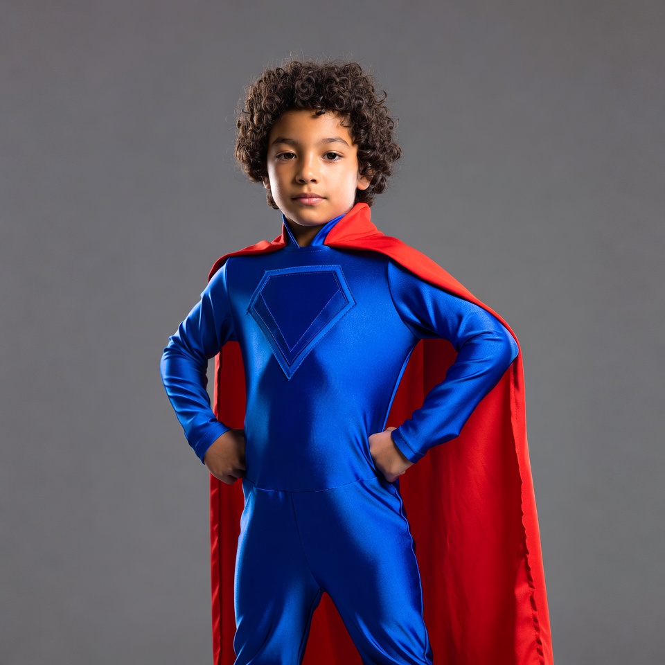 A young African-American boy with curly hair stands confidently in a blue Superman costume with a red cape on a gray background. He has hands on hips and wears the iconic Superman logo on his chest. The shiny bodysuit covers him fully, emphasizing a heroic pose.