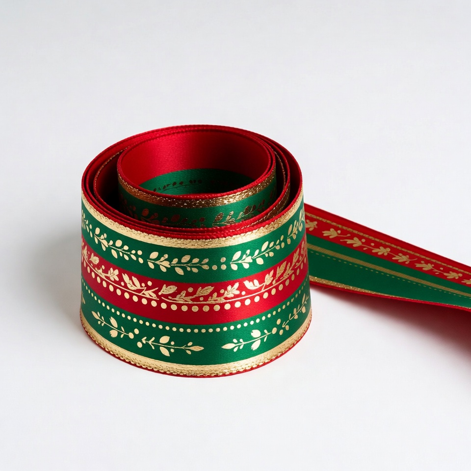 A rolled ribbon featuring red, green, and gold colors with intricate leaf patterns sits on a white background. The ribbon has shiny gold accents and decorative borders. It is tightly coiled, showcasing its festive holiday design.