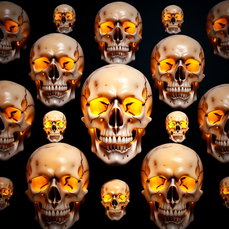 Multiple realistic 3D skulls with glowing yellow eyes are arranged in a dense cluster against a solid black background. The skulls feature cracked bone textures and open mouths, creating a dramatic Halloween effect. They are evenly spaced and face forward with intense luminous gazes.