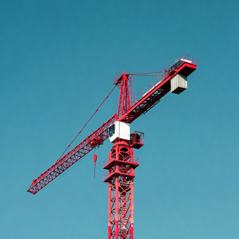 A tall red tower crane stands prominently against a clear blue sky. Its lattice boom extends horizontally with a white counterweight and cab visible. The crane's red metal framework and cables are sharply detailed.