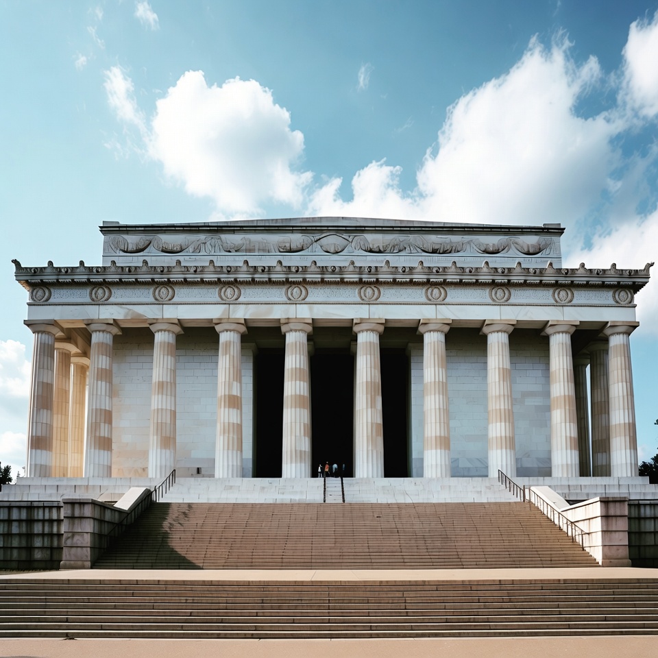 The iconic Lincoln Memorial stands majestically with its tall white columns and pediment under a clear blue sky with scattered clouds. Broad stone steps lead up to the dark entrance, flanked by symmetrical pillars. A few tiny figures are visible at the top of the steps.