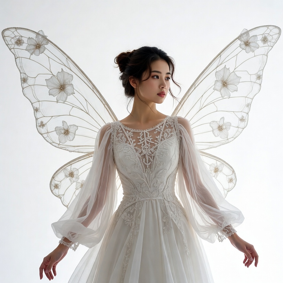 Asian, bell sleeves, bridal, bun hairstyle, costume wings, dark hair, elegant pose, ethereal, fairy wings, fairy woman, fantasy, floral lace, graceful woman, isolated background, lace dress, lace gown, large wings, long sleeves, wedding dress, white dress, white gown, white wings, wings, woman