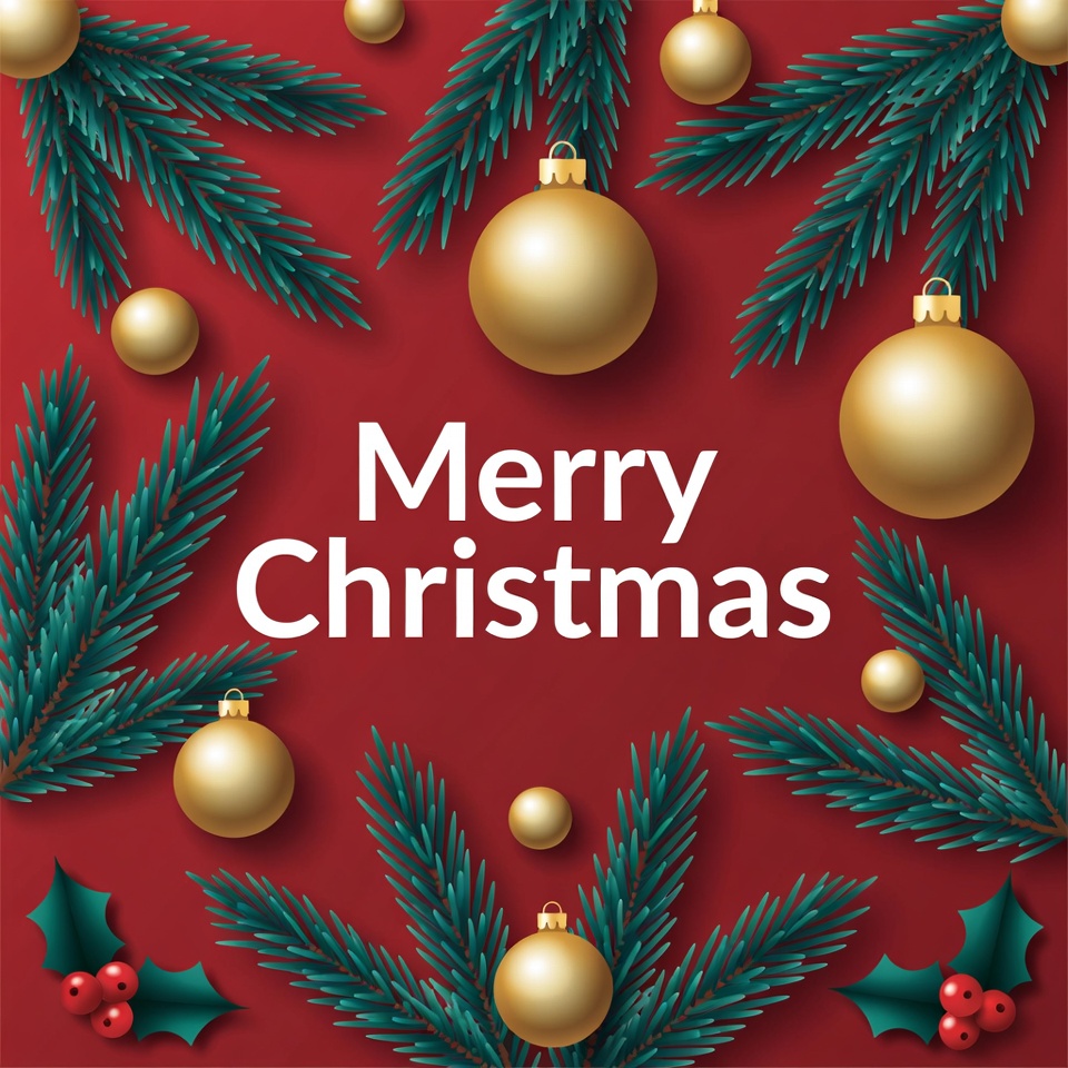 A festive Christmas design features gold baubles and green fir branches arranged on a vibrant red background. White text reads 'Merry Christmas' in the center. Red holly berries with green leaves accent the bottom corners.